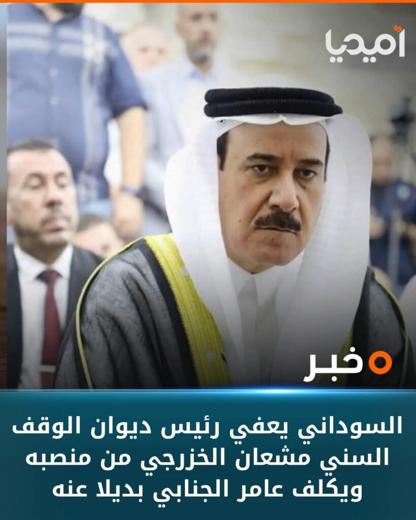 قرر رئيس الوزراء محمد شياع السوداني، اليوم الخميس، إعفاء رئيس ديوان الوقف السني، مشعان محي الخزرجي من مهامه .وذكر المكتب الإعلامي لرئيس مجلس الوزراء في بيان لـ “أميديا” أن “رئيس مجلس الوزراء، محمد شياع السوداني، قرر إعفاء رئيس ديوان الوقف السني ، مشعان محي الخزرجي ، من مهامه ، وذلك بناء على كتاب من المجمع الفقهي العراقي ، الذي رشح بدوره ثلاثة أسماء بديلة لتولي المنصب ، وفقاً لما نصت عليه المادة 4/ثانياً من قانون الوقف السني رقم (56 لعام 2012)”.وكلّف السوداني “عامر شاكر الجنابي، لتولي منصب رئيس ديوان الوقف السني لمدة ستة أشهر”، موجهاً الرئيس الجديد للديوان بالعمل على تعزيز الخطاب المعتدل ، ونبذ التطرف ، وإبعاد هذه المؤسسة الدينية المهمة عن أي استثمار سياسي أو انتخابي ، وبما يعزز مكانتها ودورها في المجتمع .